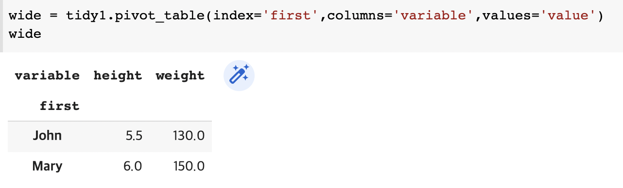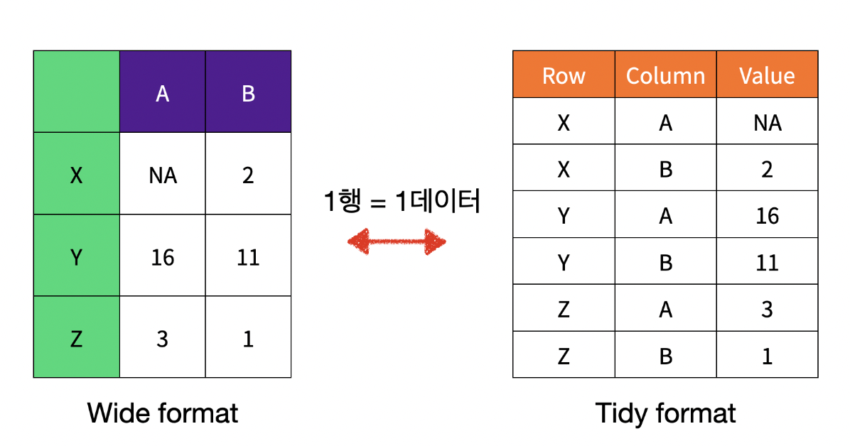예를 들어서 wid format의 경우 한 행에 x라는 사람의 키와 몸무게를 한번에 보여주는 반면, Tidy format은 한 행 마다 x라는 사람의 신체정보를 하나씩 보여주는 형태라고 볼 수 있다. (키,몸무게는 예시일 뿐)