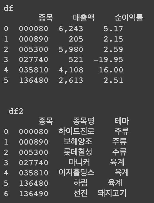 실제로 데이터에 대해서 어떻게 concat 과 merge 가 다른지 보자.