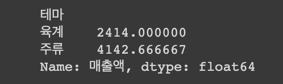 이번에는 같은 테마 별로 매출액의 평균을 구해보겠다. 이는 Group by 에 대한 개념을 이해하기 위함임을 알고 보자.