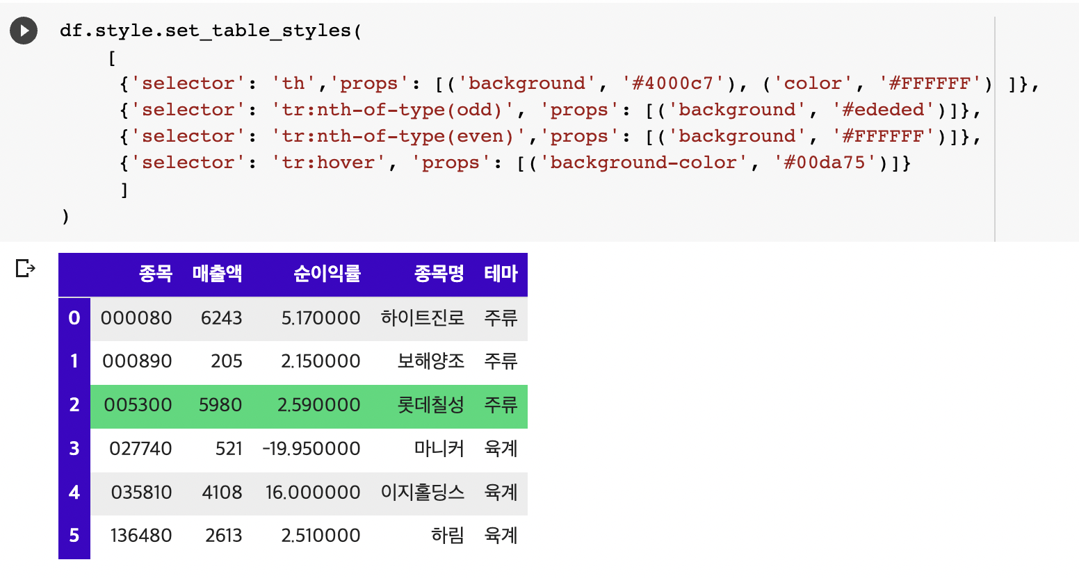 데이터프레임의 형태를 시각적으로 보기 좋게 만드는 스타일링 방법도 존재한다.