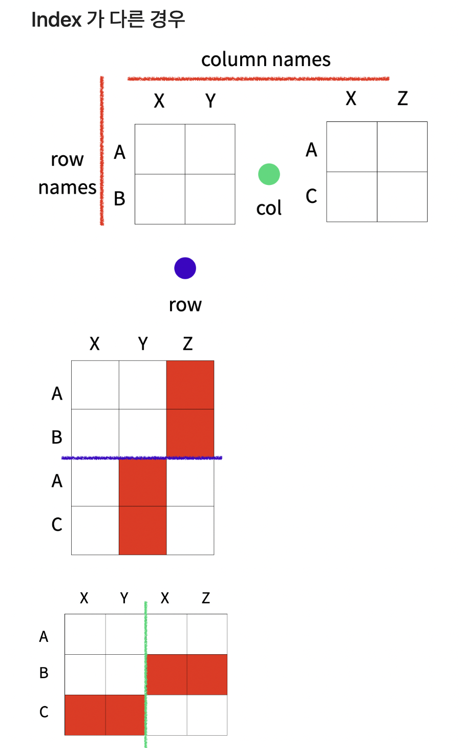빨간 부분의 데이터는 missing value로 처리 될 것이다. 두 DataFrame에 대해서 col 혹은 row 에 따라서 합쳐지는 모습을 보자.