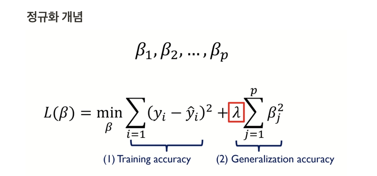 회귀계수(기울기)에 있어서 제약을 걸어줌으로 오히려 미흡 학습을 유도하는 것 = 과적합을 방지하기 위해서